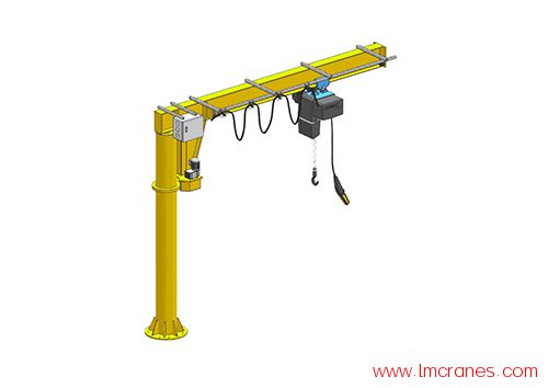 悬臂吊起重机工作强度为轻型,起重机由立柱,回转臂回转驱动装置及电动葫芦组成,立柱下端通过地脚螺栓固定在混凝土基础上,由摆线针轮减速装置来驱动悬臂回转,电动葫芦在悬臂工字钢上作左右直线运行,并起吊重物。起重机旋臂为空心型钢结构,自重轻,跨度大,起重量大,经济耐用。内置式行走机构,采用带滚动轴承的特种工程塑料走轮,摩擦力小,行走轻快;结构尺寸小,特别有利于提高吊钩行程。