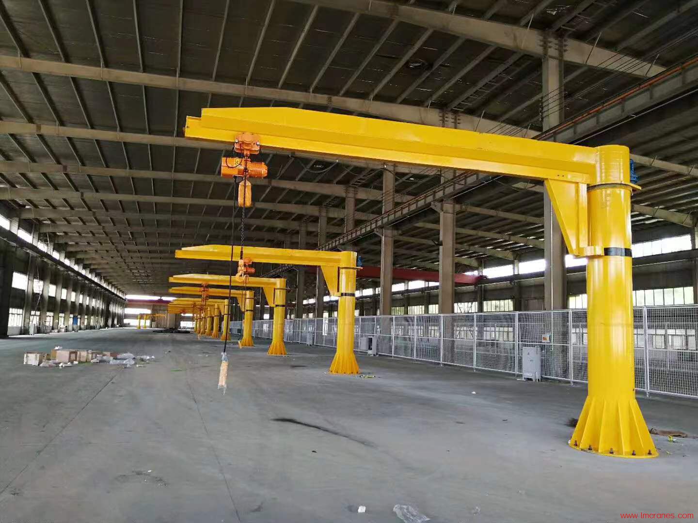 移动式悬臂吊更具灵活机动、适应性广等特点,是高效自动生产线上必备的单独应急吊装设备,有了它能确保生产线畅通无阻。